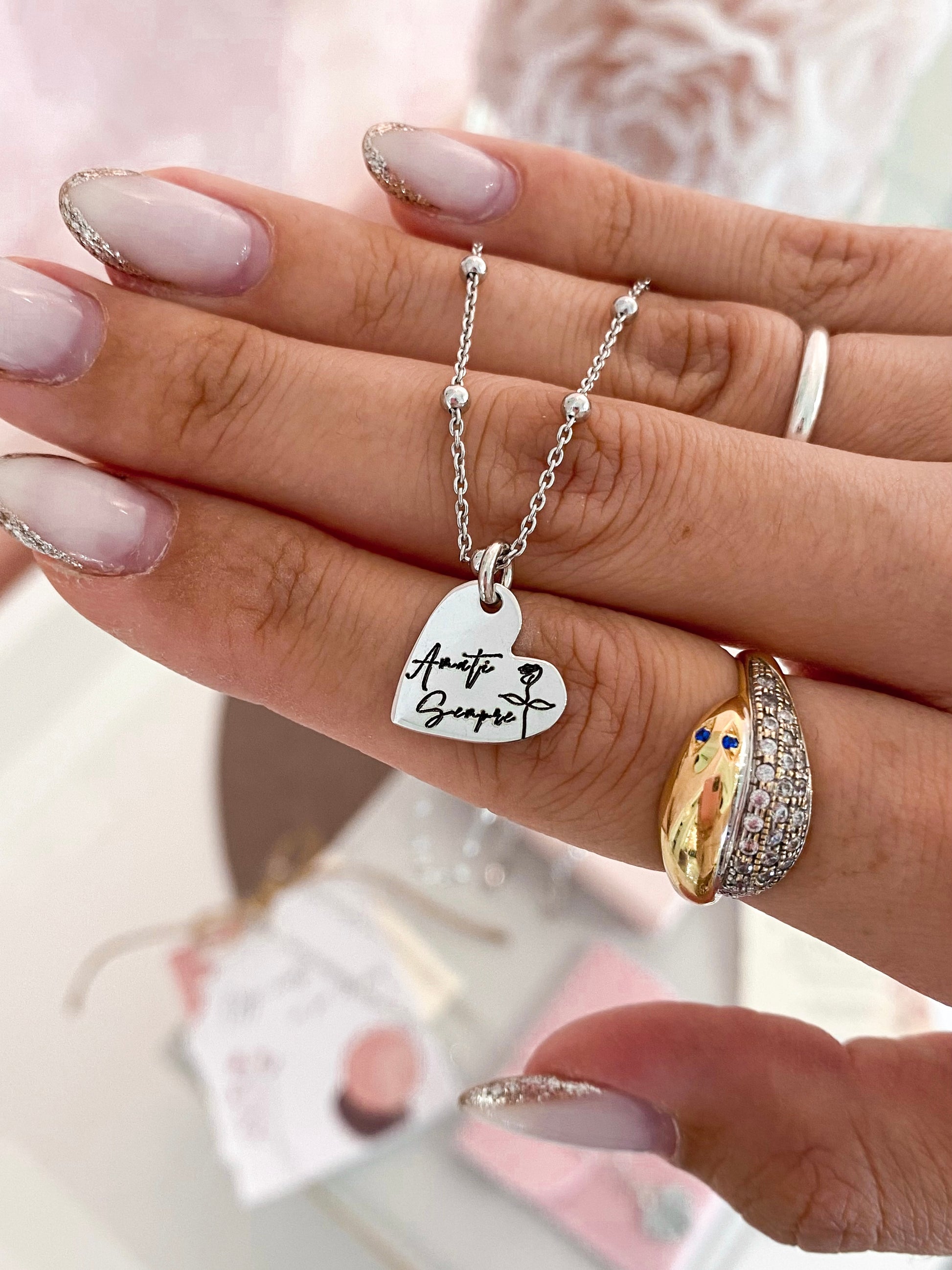 Ciondolo Limited Edition a cuore obliquo con incisione “Amati Sempre” e disegno di una piccola rosa.