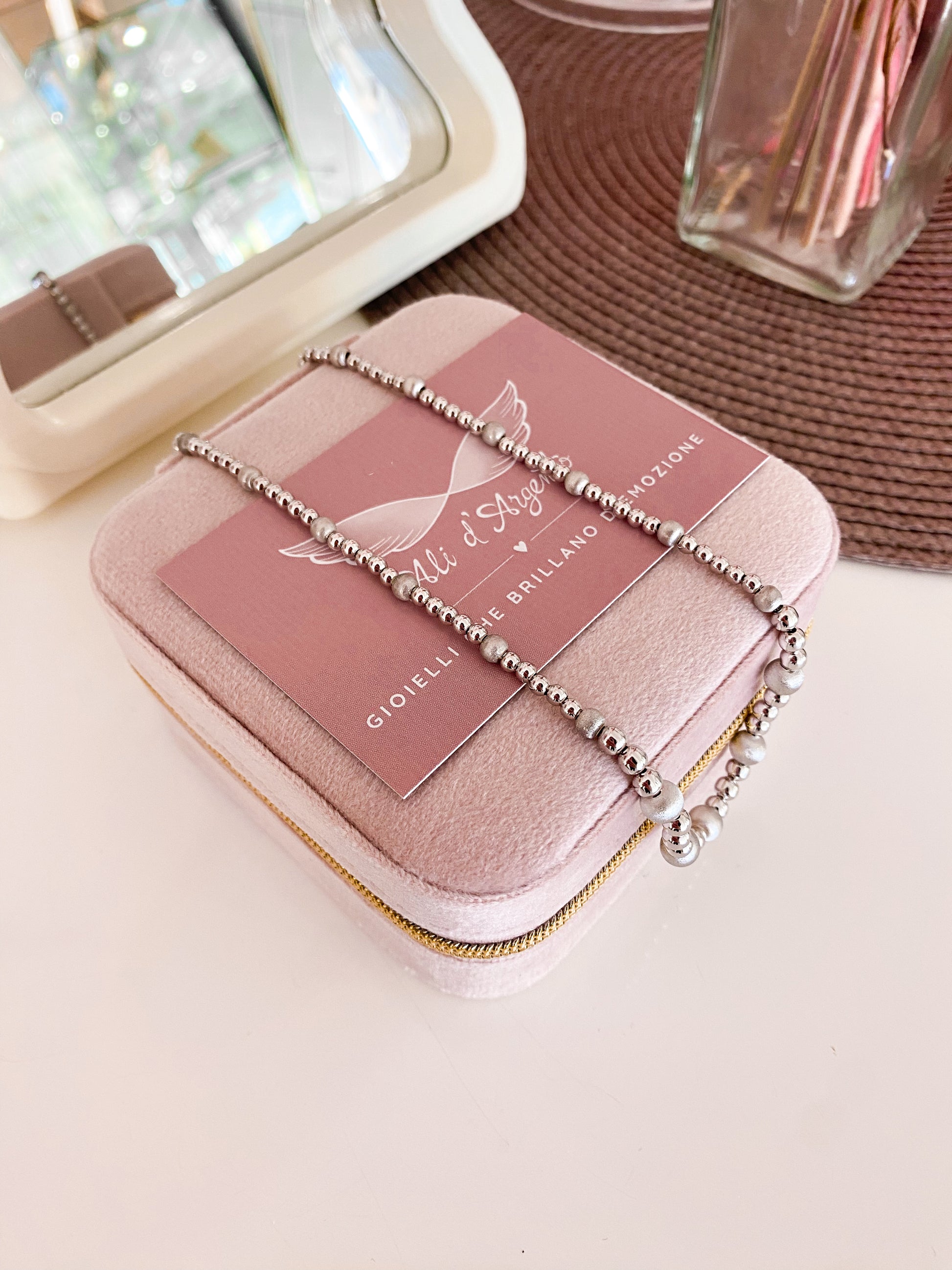 Per preservare i gioielli in Argento925 è bene evitare il contatto con sostante contenenti alcol (detersivi, creme, profumi) e con l’acqua di piscina e sorgenti termali.