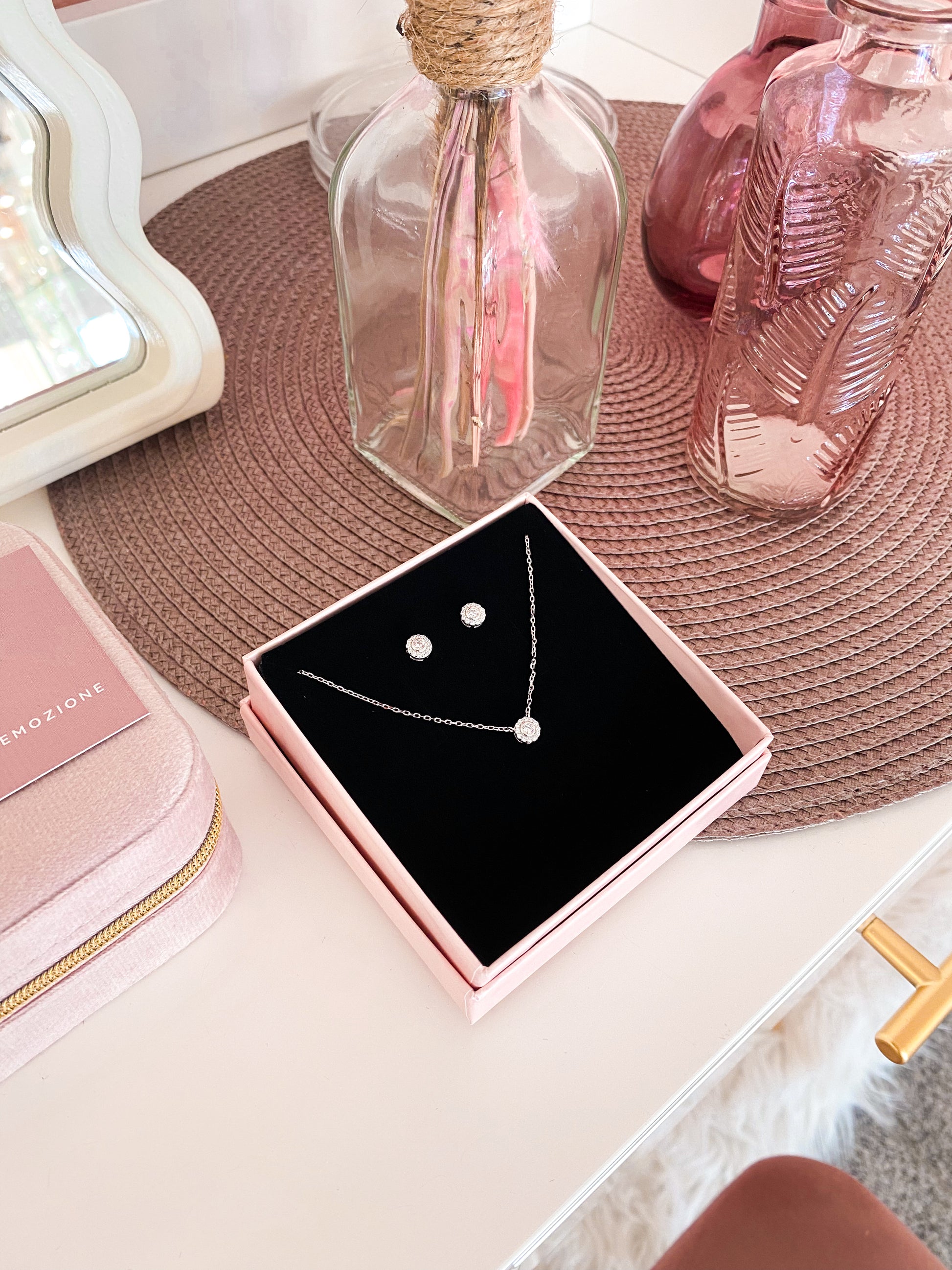 Collana e Orecchini in parure con punto luce incastonato e pavé di zirconi