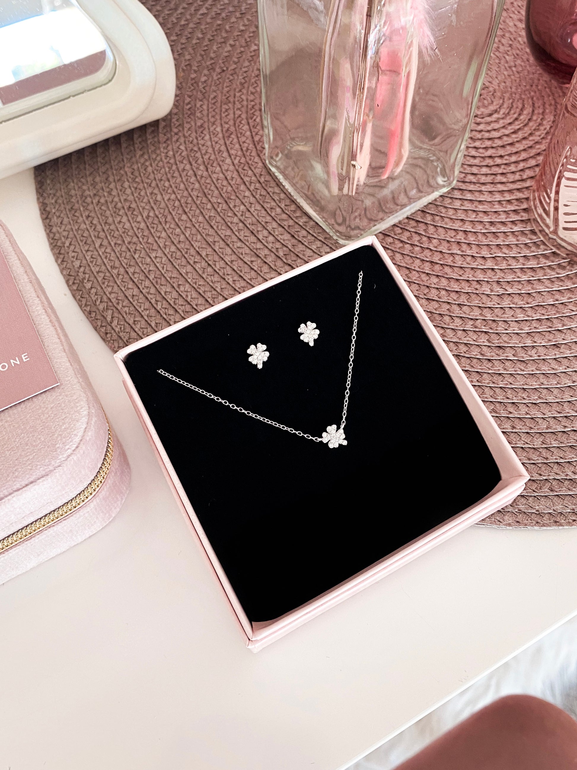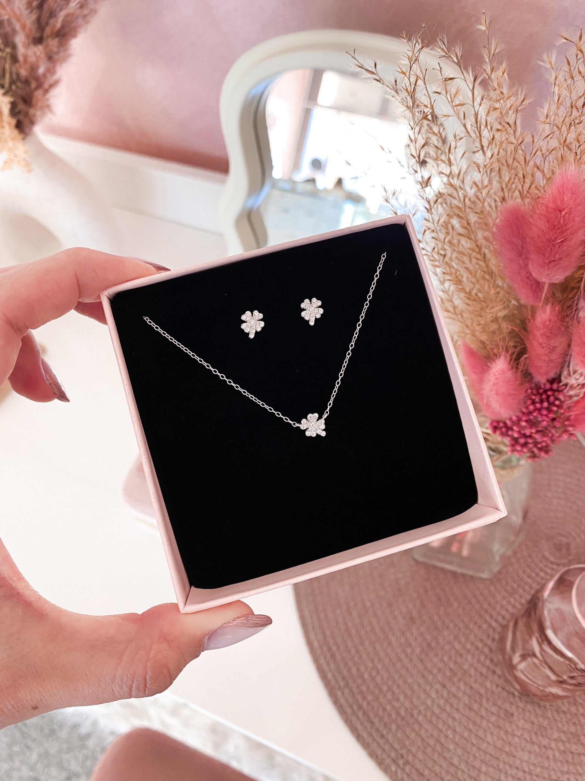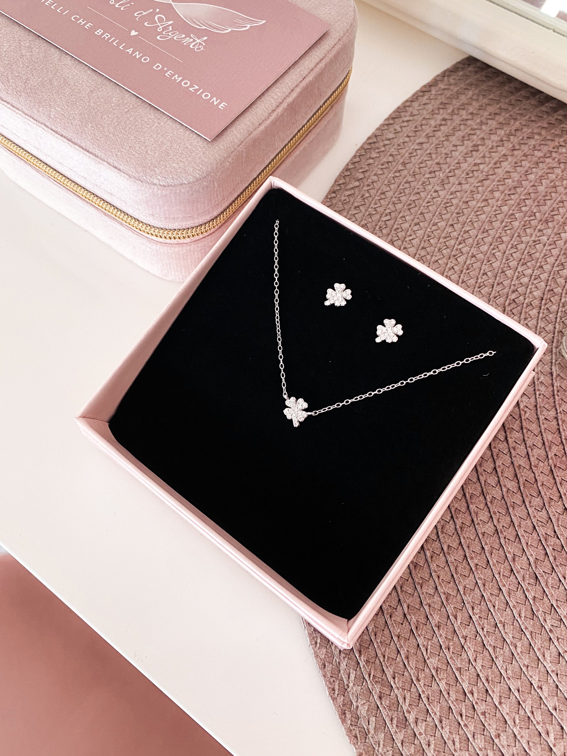 Collana d Orecchini in parure con mini quadrifoglio pavé di zirconi