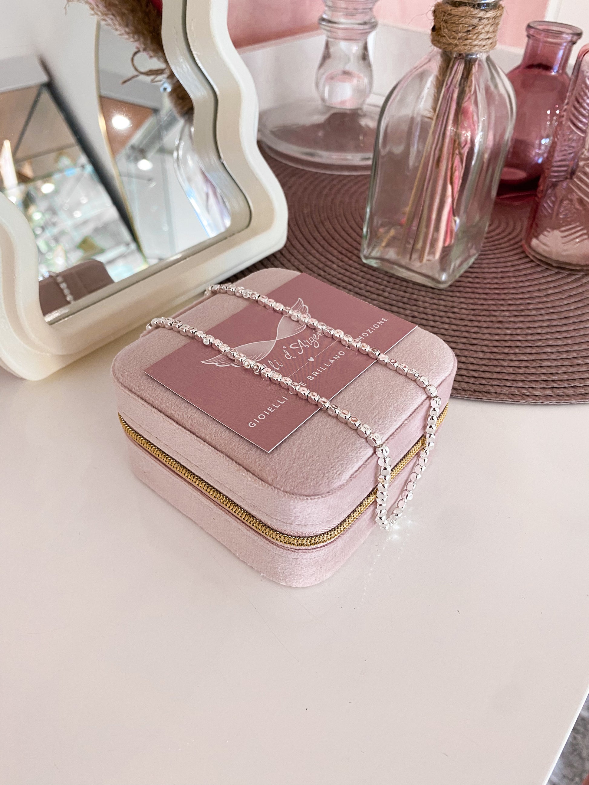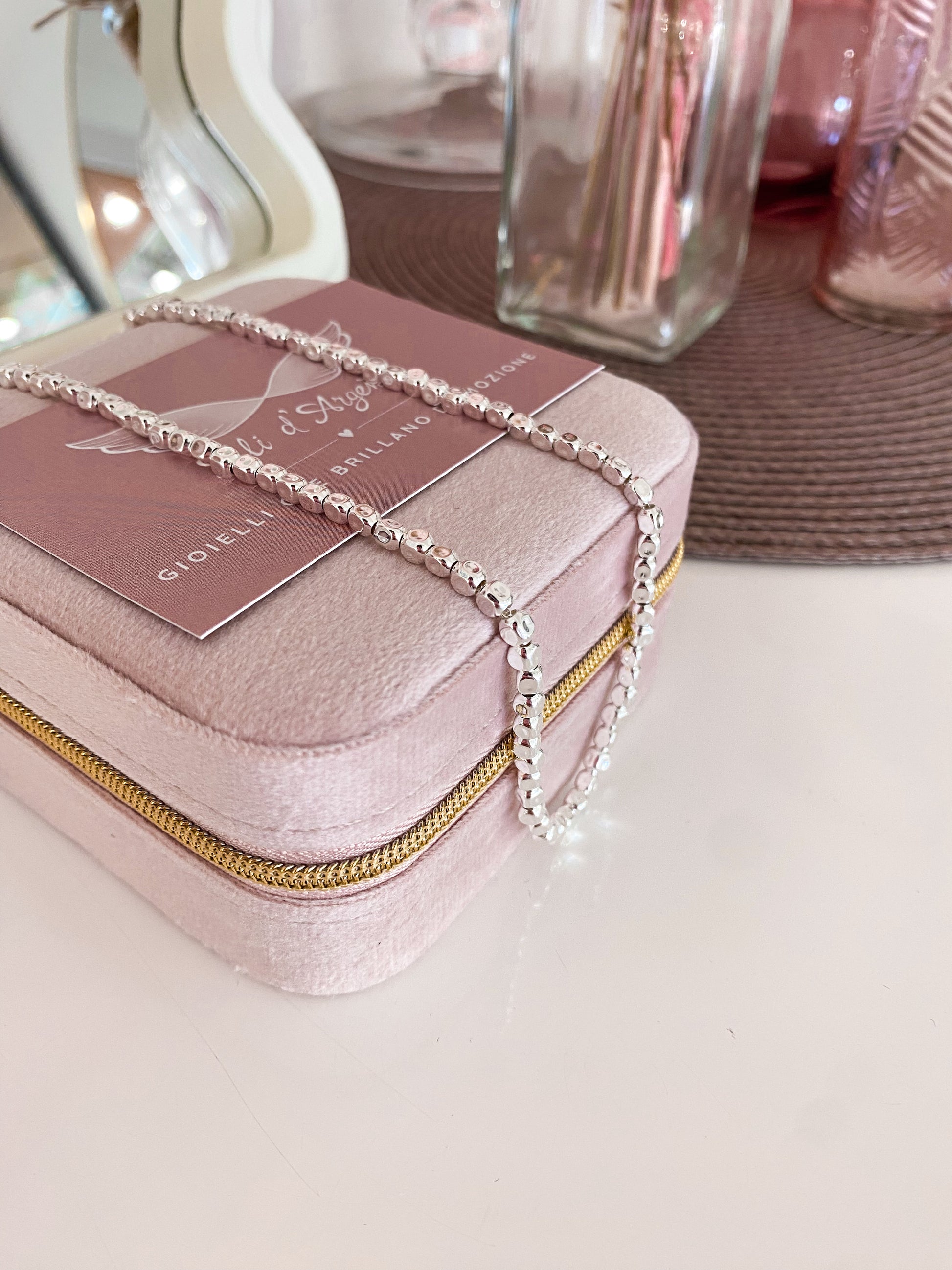Per preservare i gioielli in Argento925 è bene evitare il contatto con sostante contenenti alcol (detersivi, creme, profumi) e con l’acqua di piscina e sorgenti termali.